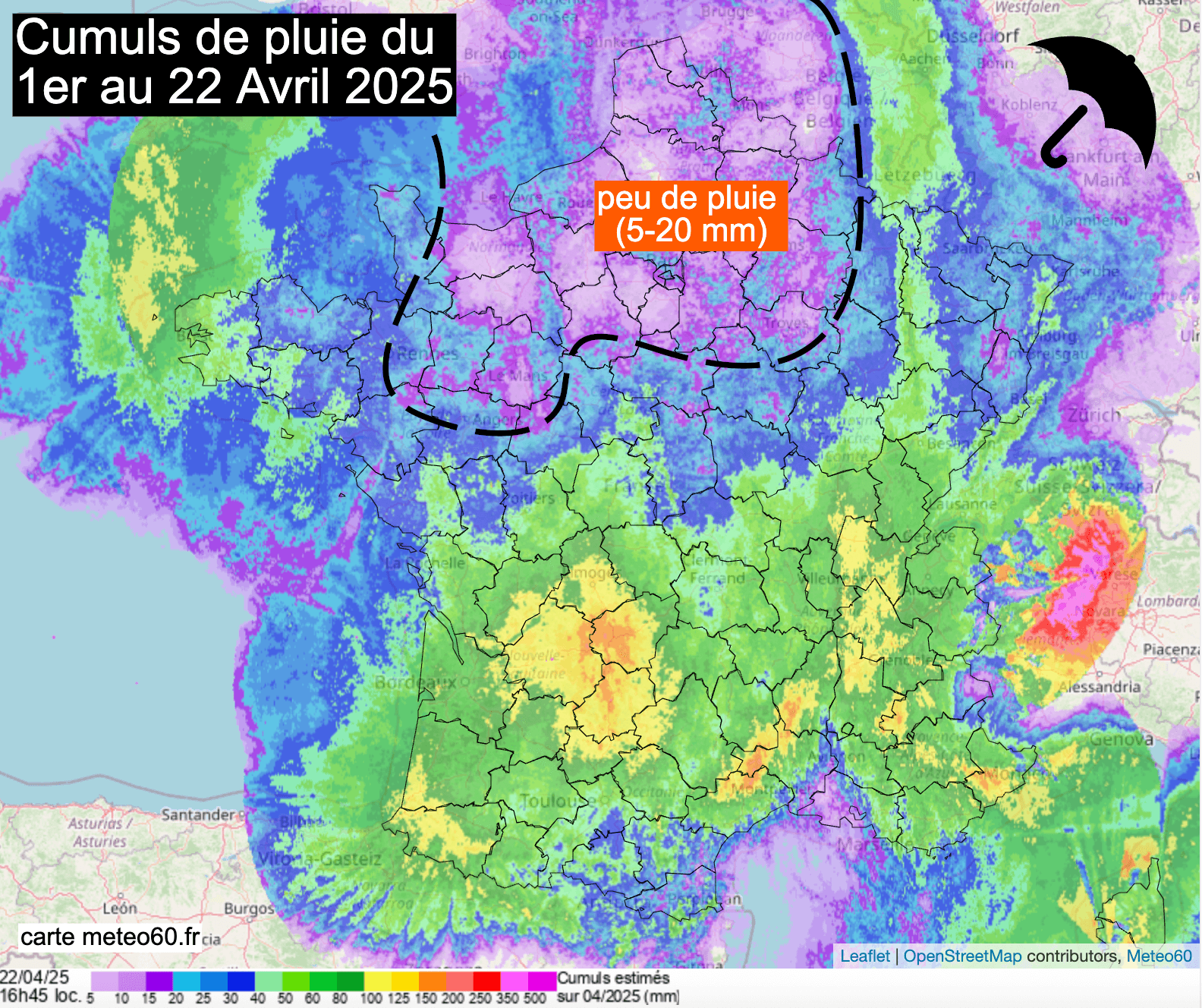 Estimation des cumuls de pluie du 1er au 22 avril 2025 - meteo60.fr