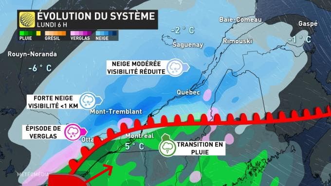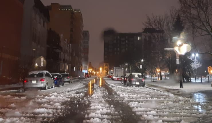 Montréal et Québec se sont retrouvées au cœur de cette zone tampon, si bien que la neige s'est changée en pluie avant le lever du jour ce lundi 23 novembre 2020, transformant le manteau neigeux en "sloche", un terme utilisé au Québec pour qualifier une neige fondante et sale, presque de la gadoue.