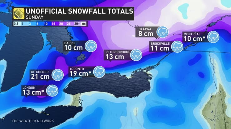 À Toronto en Ontario, il est tombé 19 centimètres de neige. Il s'agit du 3ème jour de novembre le plus enneigé sur la ville depuis le début des relevés (derrière les 30 cm du 24/11/1950 et les 33 cm du 30/11/1940) !