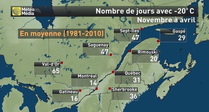 Si une température de -20°C en plaine en France relève des records et n'est quasiment plus observée de nos jours, de telles valeurs n'ont rien d'exceptionnel au cours de l'hiver Québécois. En moyenne, le thermomètre s'abaisse à -20°C ou moins 14 jours par an à Montréal. Cette valeur est même atteinte 31 jours par an à Québec et jusqu'à 65 jours au Val-d'Or !