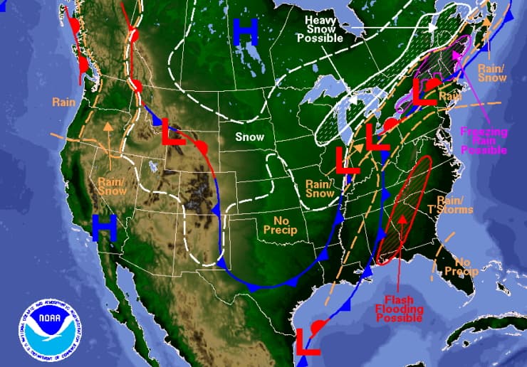 Exemple d'une situation propice à des tempêtes de neige sur le nord-est de l'Amérique - via NOAA