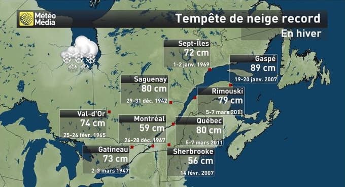 Certaines tempêtes de neige qui affectent cette partie du monde sont très impressionnantes. Au Québec, elles peuvent apporter des cumuls supérieurs à 50 centimètres en seulement 24 à 48 heures. Le cumul record laissé par une unique tempête est de 59 centimètres à Montréal (fin décembre 1967), de 80 cm à Québec (début mars 2011) et de 89 cm à Gaspé (19 & 20 janvier 2007) !