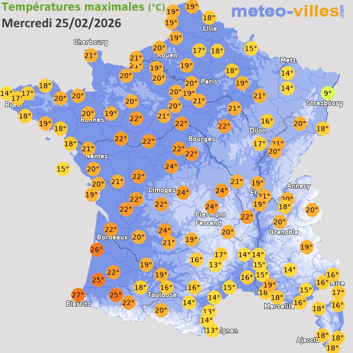 Températures maximales mesurées en France ce mercredi 25 février 2026 - Météo Villes