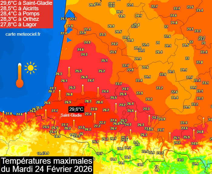 Le printemps est déjà là, pour ne pas dire l'été ! Ces dernières heures, les températures s'envolent à des niveaux remarquables en France. Les premières chaleurs de l'année ont concerné le sud-ouest ce mardi 24 février 2026. Au pied des Pyrénées, la barre des 25°C a été allègrement dépassée et on s'est même approché des 30°C dans le Béarn avec une température maximale de 29,5°C mesurée à Saint-Gladie-Arrive-Munein, loin devant son record de 27,0°C en février 2020 ! On peut aussi noter 26,6°C à Biarritz, 26,2°C à Pau, 25,9°C à Saint-Girons ou encore 25,2°C à Dax.