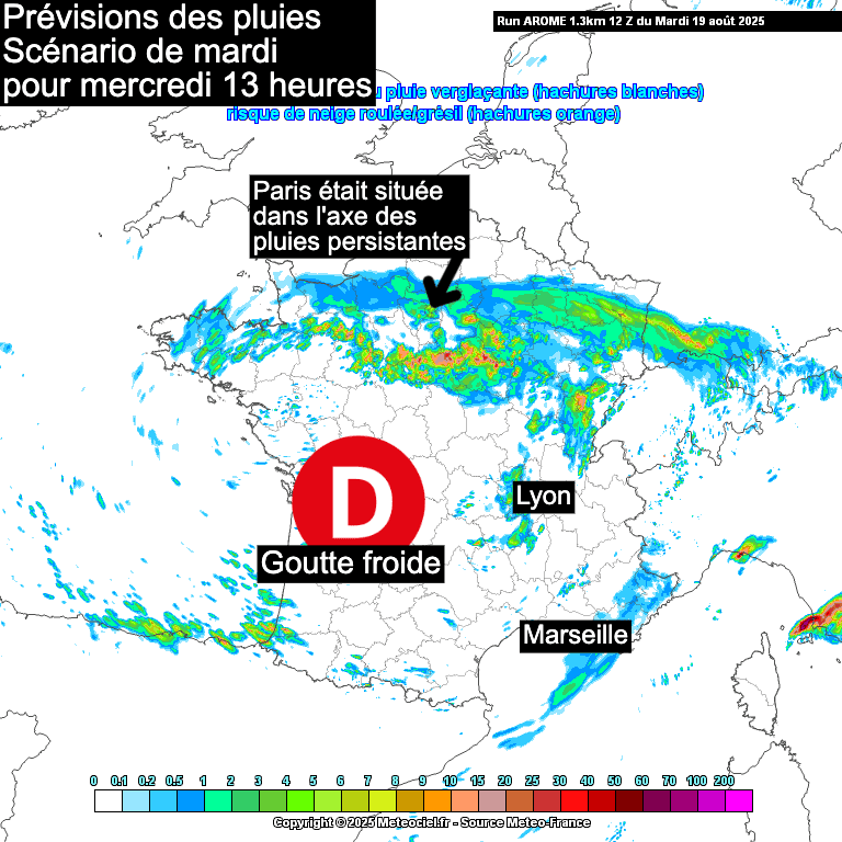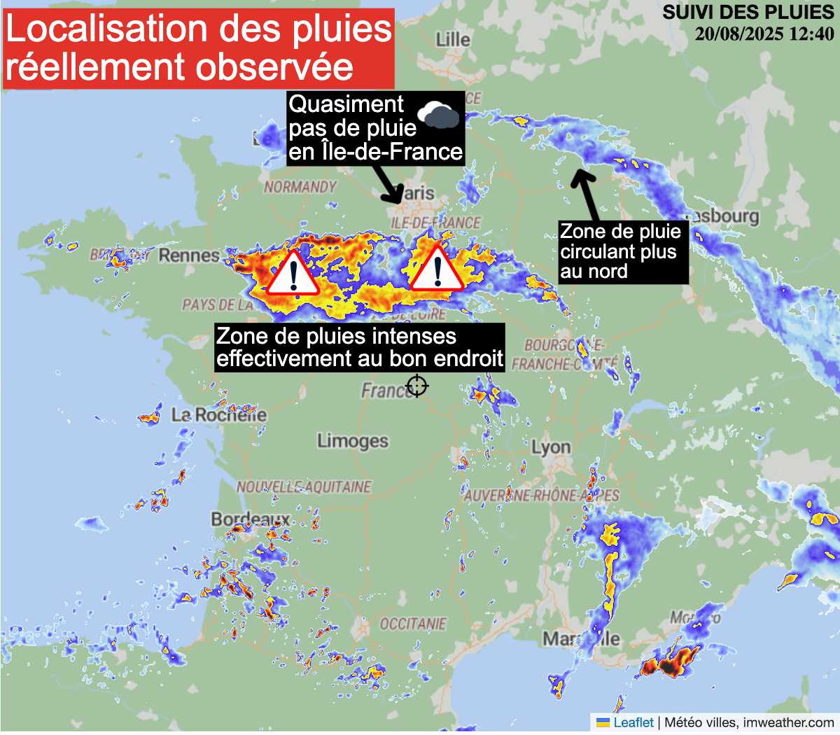 Par exemple, des pluies importantes qui devaient concerner l'Île-de-France se sont en fin de compte déplacées un peu plus vers le sud. Ceci est assez classique en présence d'une goutte froide, nécessitant un suivi permanent et une navigation à vue…