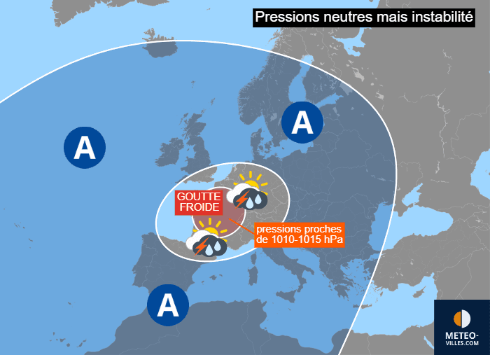 Situation de goutte froide avec pressions neutres mais temps instable - Météo Villes