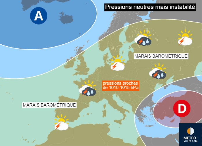 Situation de marais barométrique avec pressions neutres mais temps instable - Météo Villes