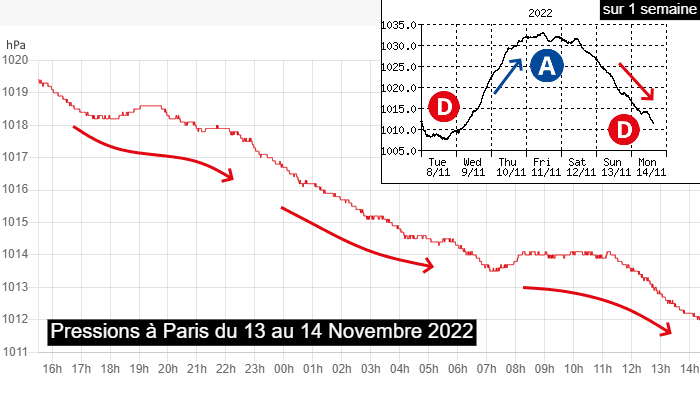 Si vous possédez un baromètre, vous avez pu observer parfaitement ces changements de régime. Alors qu'il indiquait des pressions dépressionnaires au début de la semaine dernière, il s'est envolé au-delà des 1030 hPa sur Paris entre le jeudi 10 et le samedi 12 novembre 2022. Si le temps était encore très calme en France ce dimanche 13 novembre, tous les baromètres du pays étaient en baisse, un fait annonciateur d'un changement à venir. Cette baisse s'est prolongée sans discontinuer ce lundi 14 novembre avec un passage à des niveaux dépressionnaires.