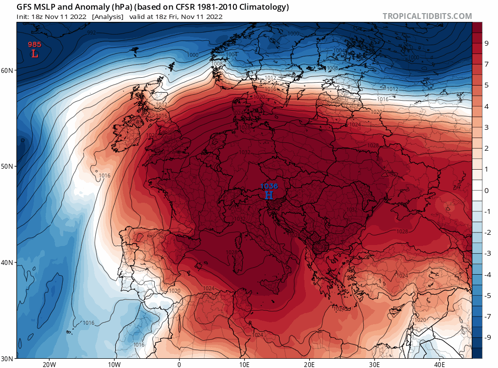 Anomalies de pressions du samedi 12 au mercredi 16 novembre 2022 - via tropicaltidbits.com