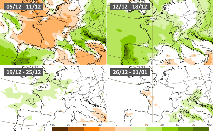 Projection des anomalies pluviométriques jusqu'à la fin décembre 2022 - modèle européen via ECMWF