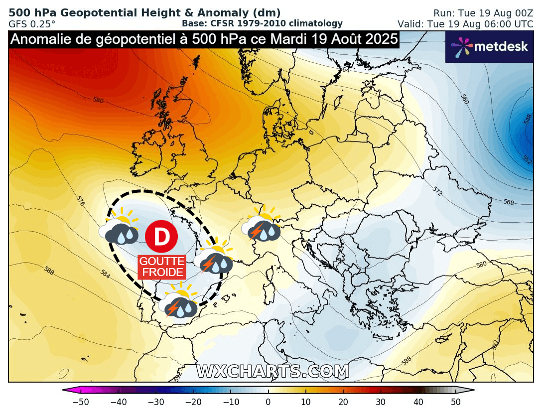 C'est une goutte froide qui se rend responsable de la dégradation orageuse qui se mettra en place au cours des prochaines heures. Arrivant par l'Atlantique, elle se décale vers le golfe de Gascogne dès ce mardi 19 août 2025 puis va migrer vers le sud de la France et finir par être reprise par un talweg issu d'une dépression scandinave. Ainsi, l'instabilité va concerner de nombreuses régions françaises et engendrer des orages ainsi que des pluies parfois soutenues.