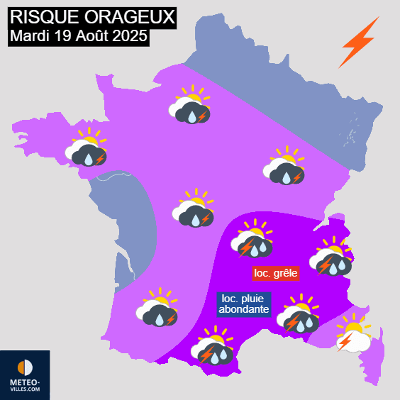 Carte du risque orageux pour le mardi 19 août 2025 - Météo Villes