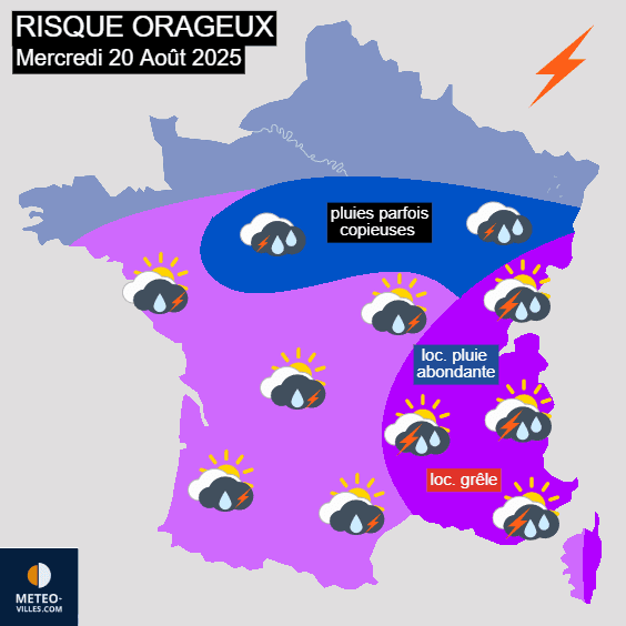 Carte du risque orageux pour le mercredi 20 août 2025 - Météo Villes