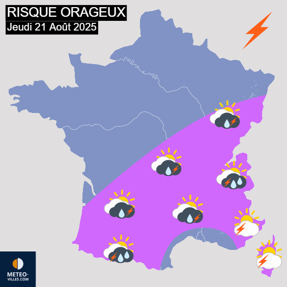 Carte du risque orageux pour le jeudi 21 août 2025 - Météo Villes