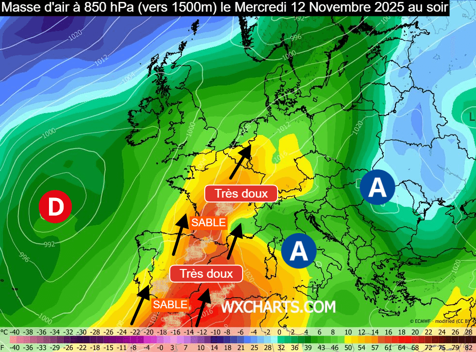 Situation météorologique en Europe ce mercredi 12 novembre 2025 avec remontées de sable - wxcharts.com