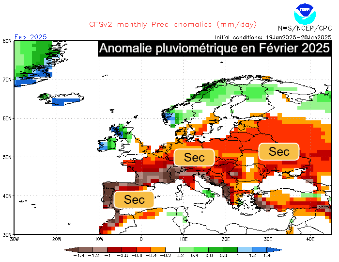 Anomalie pluviométrique envisagée par le modèle américain pour le mois de février 2025 - via NOAA