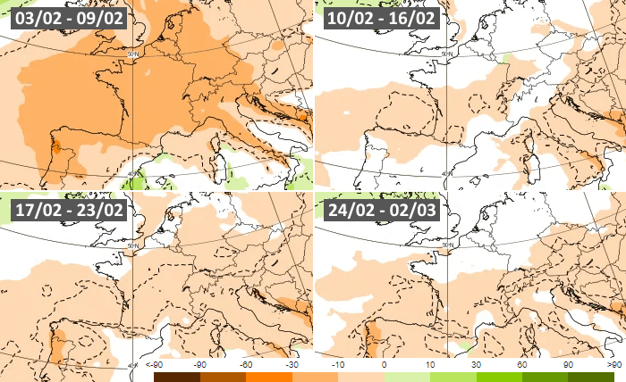 Par conséquent, le modèle européen envisage un déficit pluviométrique important sur la France au cours de la semaine du 3 au 9 février 2025, qui pourrait s'avérer intégralement sèche dans de nombreuses régions. Le modèle maintient un déficit de pluie lors des trois semaines suivantes, un peu moins évident sur les régions du nord où il n'est pas impossible que quelques fronts en fin de vie parviennent à s'échouer. Globalement, février 2025 serait donc un mois sec.