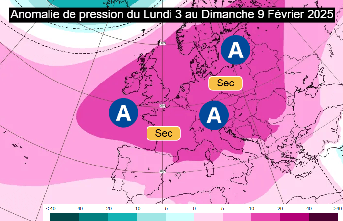 Anomalie de pression du lundi 3 au dimanche 9 février 2025 - via ECMWF