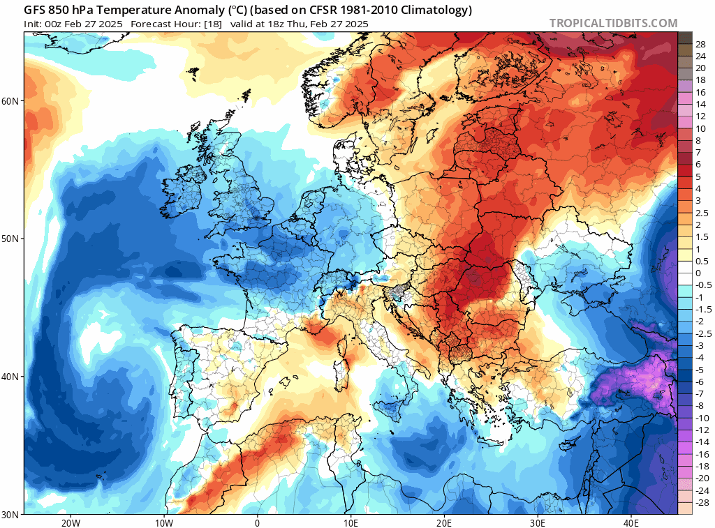 Écart à la normale de la masse d'air vers 1500m du jeudi 27 février au jeudi 6 mars 2025 - tropicaltidbits.com