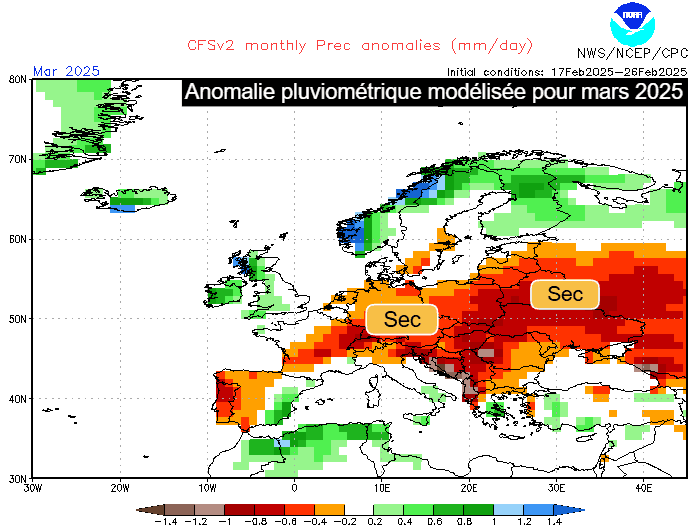 À ce jour, le mois de mars 2025 - dans sa globalité - est toujours modélisé plus sec que la normale. Le déficit pluviométrique se ferait surtout sentir entre le sud-ouest et le nord-est de la France. En effet, quelques anomalies instables en Méditerranée pourrait apporter une pluviométrie dans les normes sur ces régions. Il en serait de même sur le nord-ouest de l'hexagone, en marge d'un flux océanique perturbé qui dominerait le mois de mars chez nos voisins britanniques.
