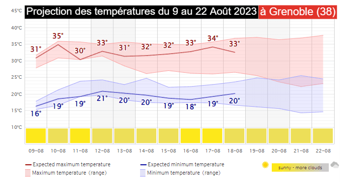 Projection des températures à Grenoble (38) du 9 au 22 août 2023 - graphique meteologix.com