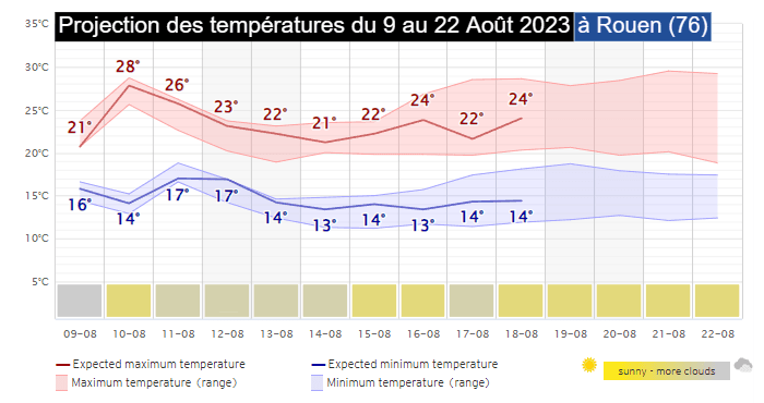 Projection des températures à Rouen (38) du 9 au 22 août 2023 - graphique meteologix.com