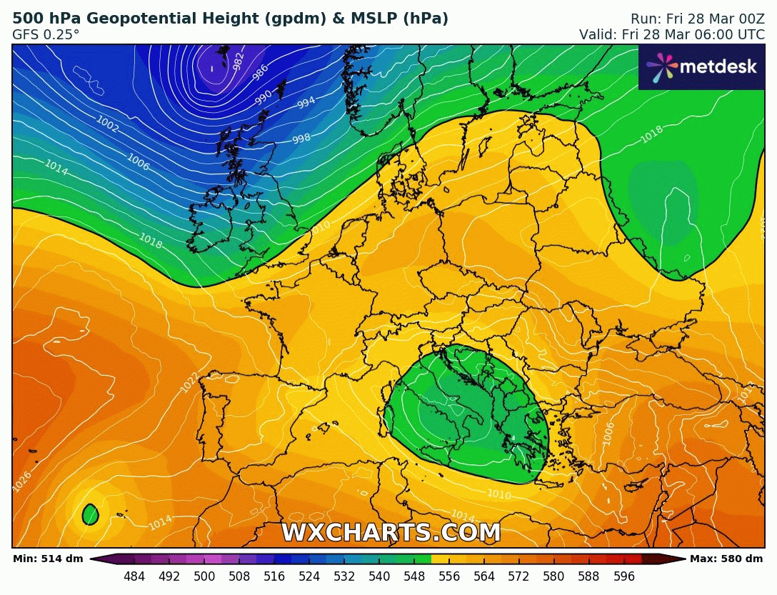 Animation des géopotentiels sur l'Europe du 28 mars au 4 avril 2025 – Modèle GFS via WX CHARTS