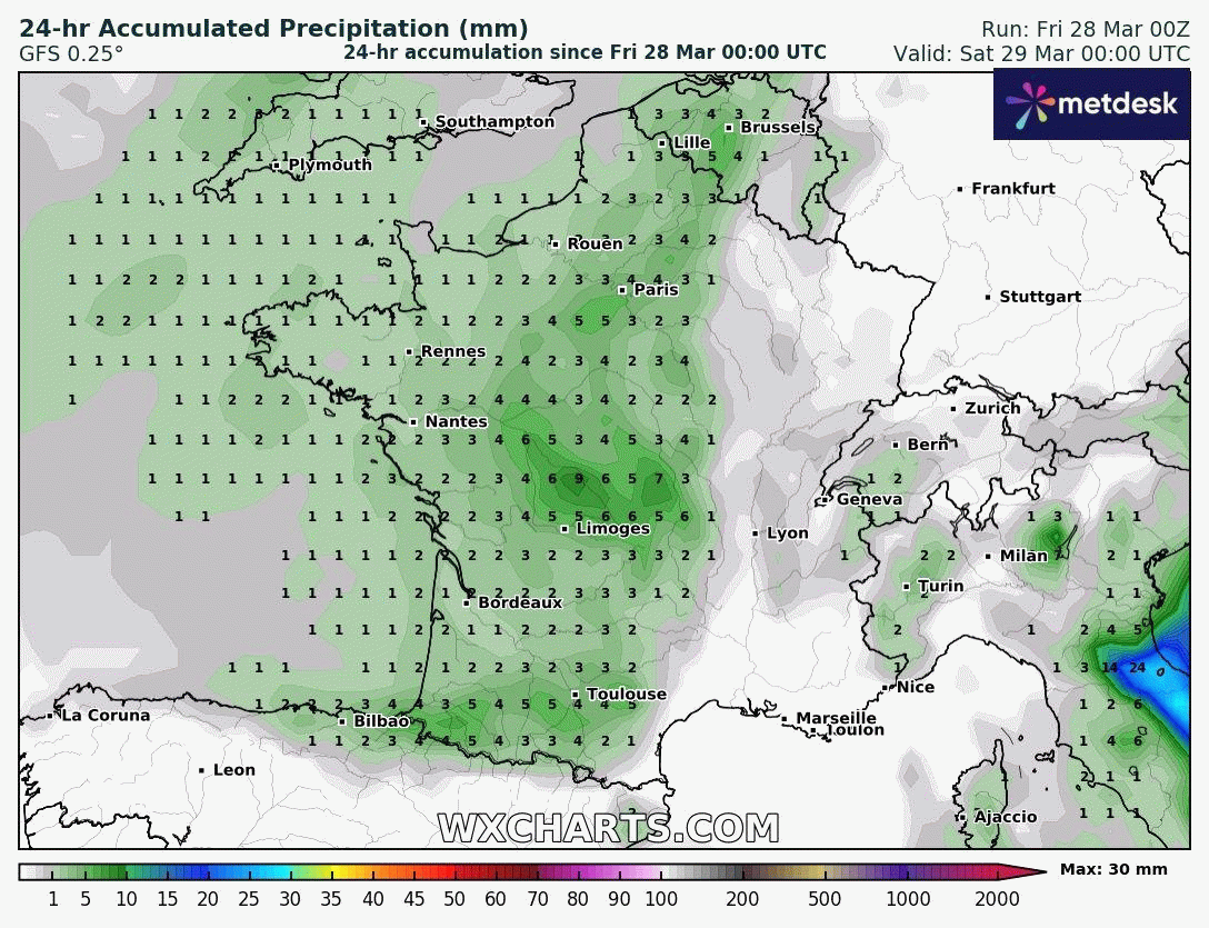 Animation des cumuls de précipitations en 24h du 28 mars au 4 avril 2025 sur la France – Modèle GFS via WX CHARTS