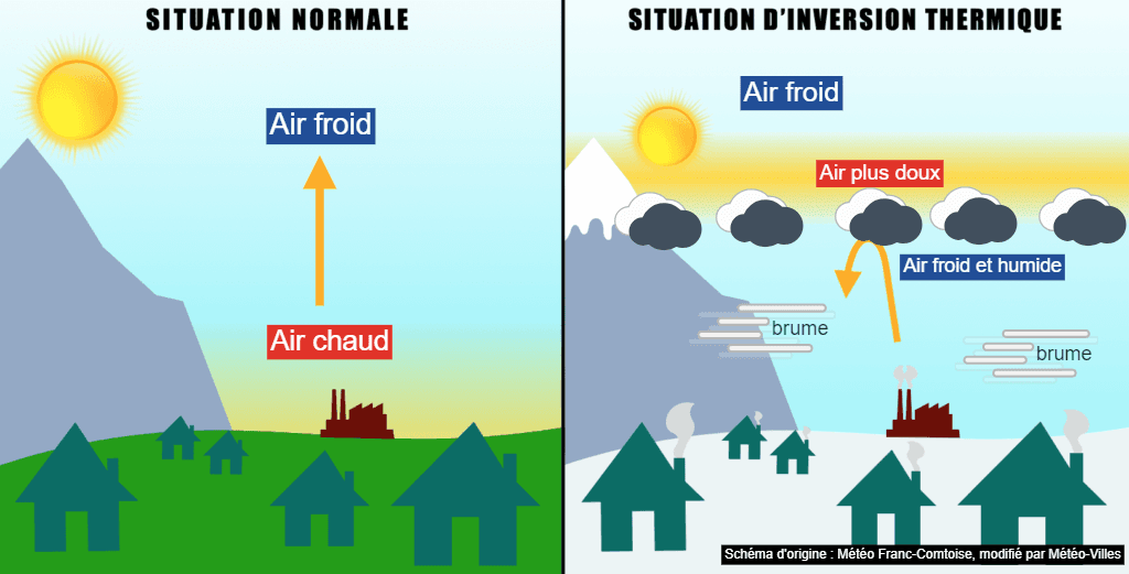 Comparaison entre une situation "normale" et une situation d'inversion thermique - Schéma : Météo Franc-Comtoise, modifié par Météo-Villes