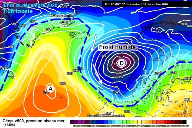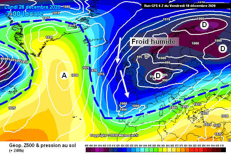 Schéma de la situation atmosphérique sur l’Ouest de l’Europe le lundi 28 décembre – Modèle CEP via météociel.fr