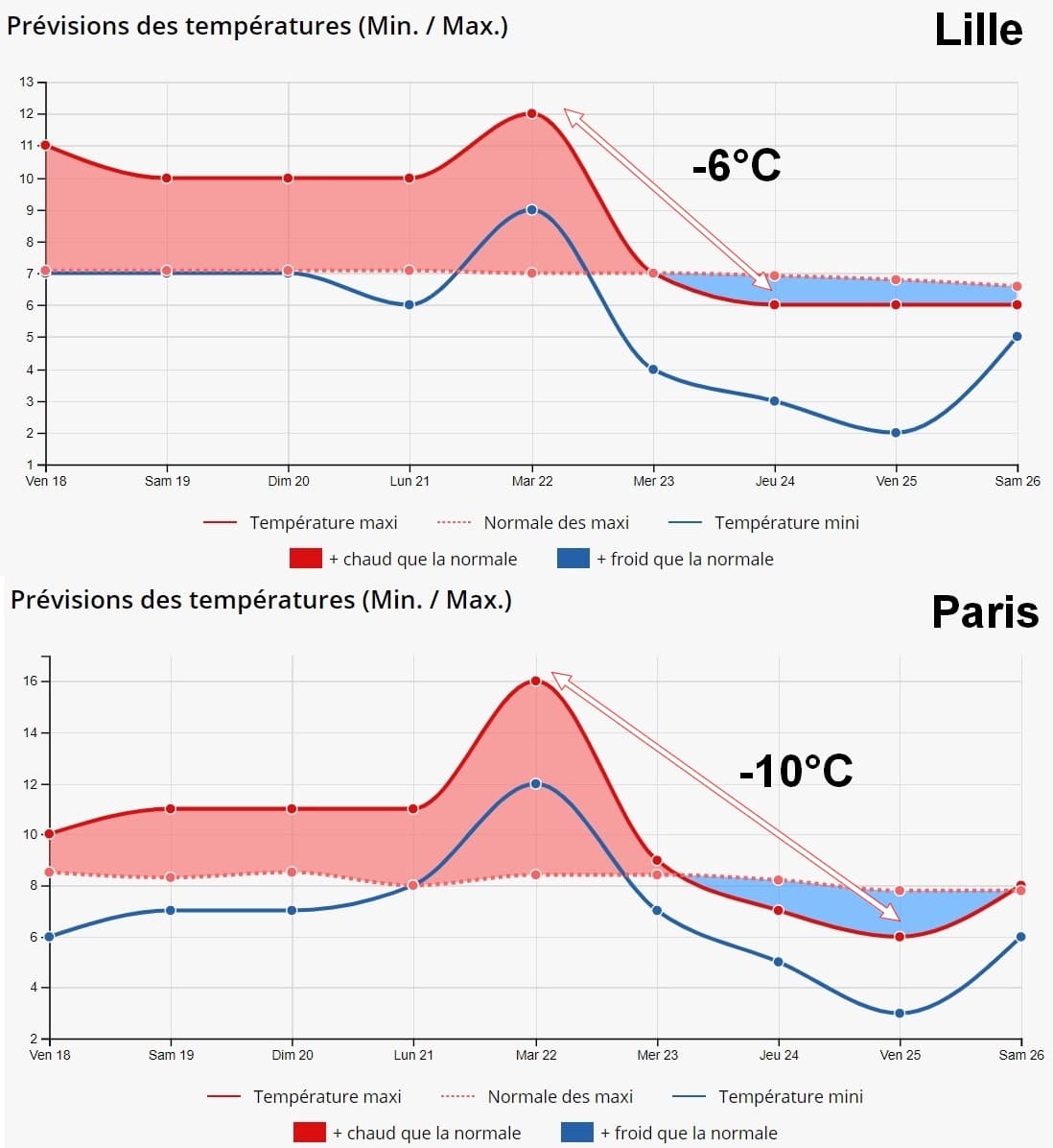 Graphique de l’évolution des températures à Lille et Paris dans les prochains jours – Météo-Villes