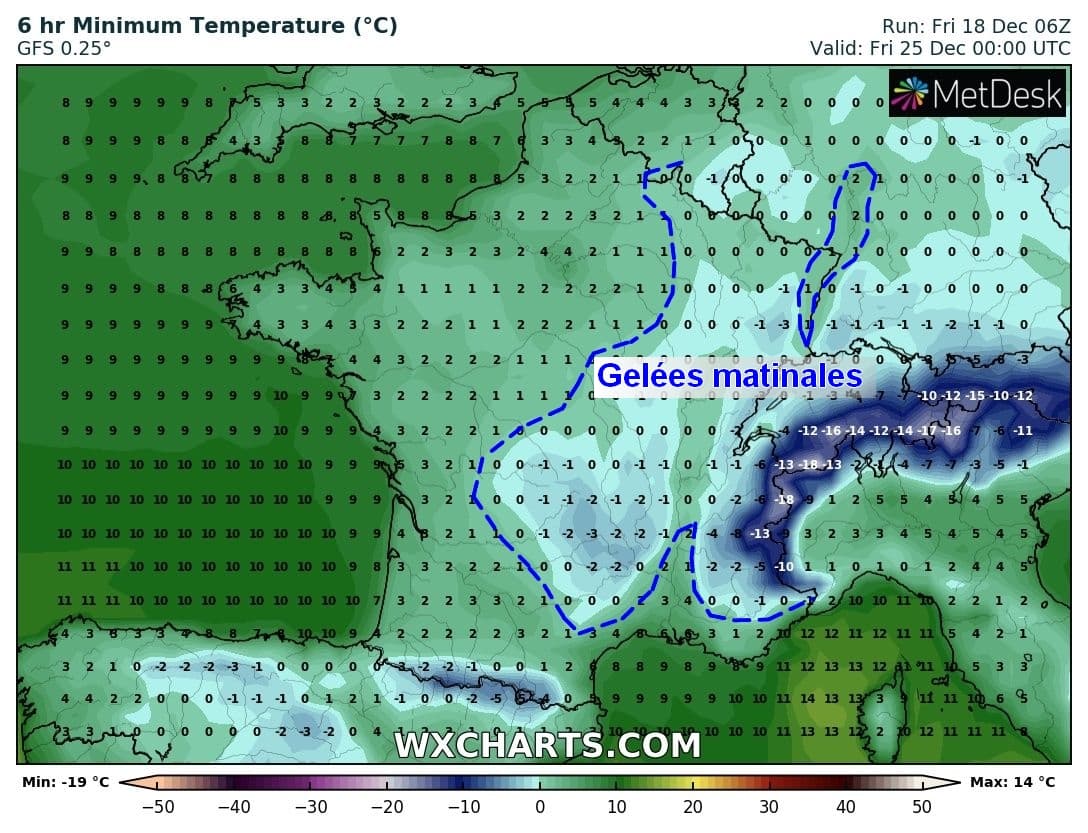 Ce coup de froid marquera également le retour des gelées matinales, plutôt généralisées le matin de Noël et apportant une ambiance bien plus de saison. Si le gel ne sera que local près de l'Atlantique, du Sud-Ouest et des plaines du Nord du pays, celui-ci sera bien plus fréquent entre les vallées du Massif-Central, des Alpes et sur le Nord-Est.
