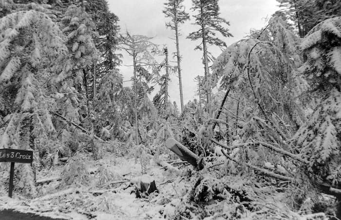 Un habitant se souvient, dans un groupe de souvenirs en ligne : « On descendait la rue sous des branches qui pliaient, prêtes à casser sous le poids de la neige. » Dans certaines rues du centre, des blocs de neige se détachent des toits et écrasent les voitures en stationnement. Par miracle, on ne déplore pas de victimes, mais plusieurs véhicules sont réduits à l’état d’épaves.