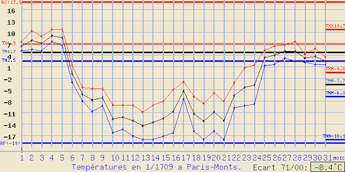Janvier 1709 est également cité pour son froid polaire. Médecin français, Louis Morin de Saint-Victor réalise des relevés de température à Paris. Ainsi, on sait que la capitale est frappée par un froid glacial du 6 au 23 janvier 1709 ! Les températures minimales chutent entre -10 et -18°C et les maximales plafonnent entre -5 et -10°C, des niveaux impensables aujourd'hui ! L'écart mensuel aux normales 1971-2000 serait de -8,4°C ! Ce froid glacial concerne aussi le sud du pays. La plupart des fleuves français gèlent, comme la Garonne que l'on traverse à cheval selon les récits d'époque !