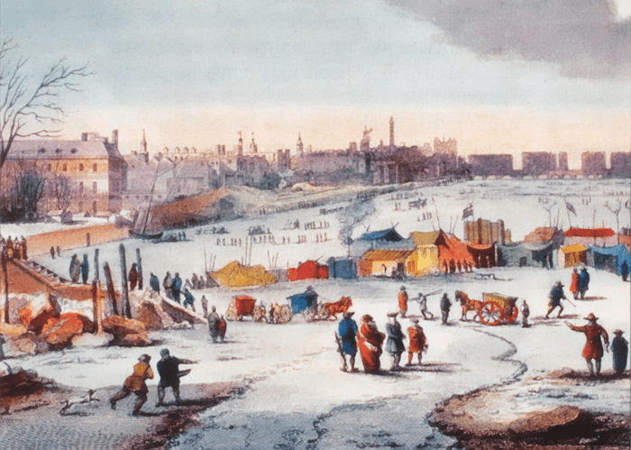 Parmi les hivers les plus froids du "petit âge glaciaire", l'hiver 1683-1684 est souvent qualifié de "grand gel en Europe". Certains historiens le décrivent comme l'hiver le plus sévère du millénaire. S'il n'y a pas de relevés de température, on sait qu'un froid glacial s'abat sur toute l'Europe du Nord, l'Angleterre, la Belgique, la France et la Suisse entre la fin décembre 1683 et février 1684. Les récits parlent de 56 jours de gel consécutifs à Paris ! À Londres, la Tamise gèle pendant deux mois et la glace atteint 28 centimètres d'épaisseur ! Le Lac Léman se fige aussi dans la glace pendant 18 jours !