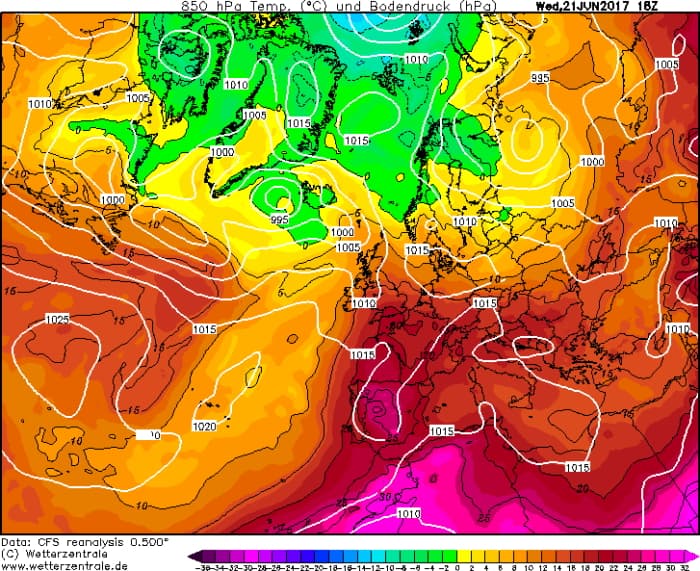 Carte des masses d'air à échelle continentale le 21 juin 2017 - via wetterzentrale