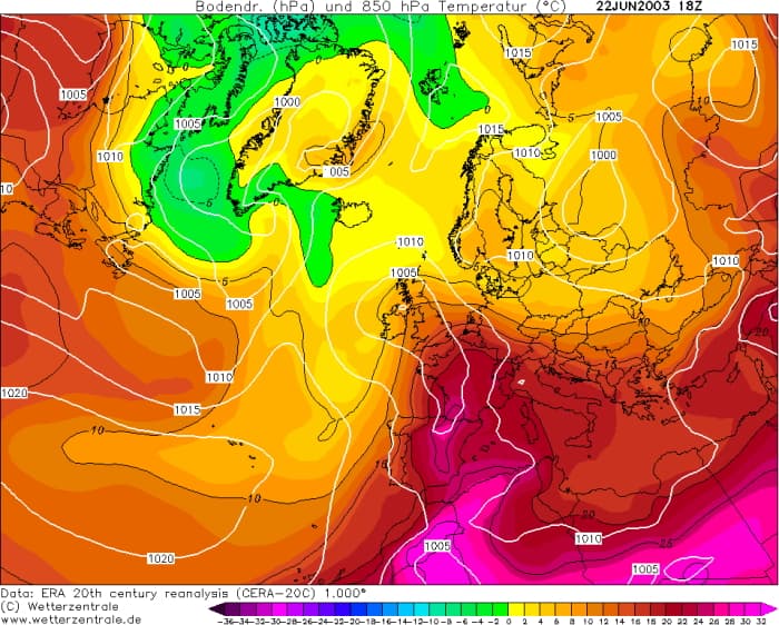 Carte des masses d'air à échelle continentale le 22 juin 2003 - via wetterzentrale