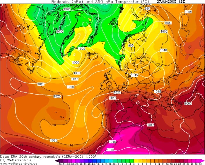Carte des masses d'air à échelle continentale le 27 juin 2005 - via wetterzentrale