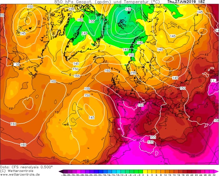 Carte des masses d'air à échelle continentale le 27 juin 2019 - via wetterzentrale