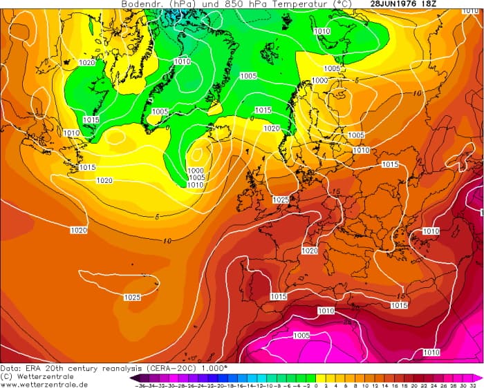 Carte des masses d'air à échelle continentale le 28 juin 1976 - via wetterzentrale