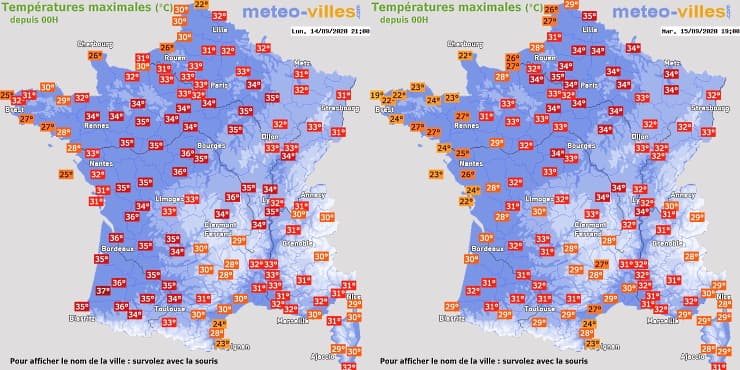 Le 14 septembre 2020, dépasse la barre des 35°C à Angers, Bourges, Poitiers, Nevers, Tours ou encore Le Mans. Encore plus impressionnant, le thermomètre atteint 35,1°C à Lille le 15 septembre 2020. La ville pulvérise son record pour un mois de septembre et atteint les 35°C pour la première fois au delà d'un 25 août - soit 3 semaines plus tard !