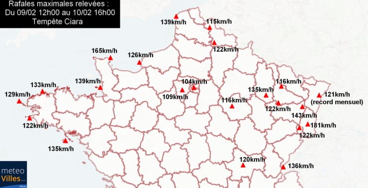 Carte des rafales maximales de la tempête Ciara sur le nord de la France - Météo Villes