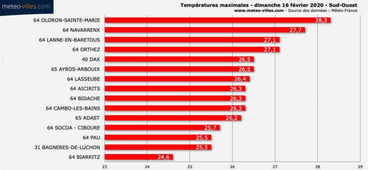 Températures maximales au sud-ouest le dimanche 16 février 2020 - Météo Villes