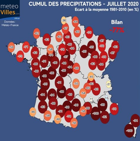 Rapport à la normale du cumul de pluie en juillet 2020 en France - Météo Villes