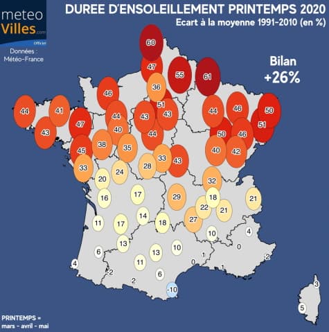 Rapport à la normale de la durée d'ensoleillement au printemps 2020 - Météo Villes