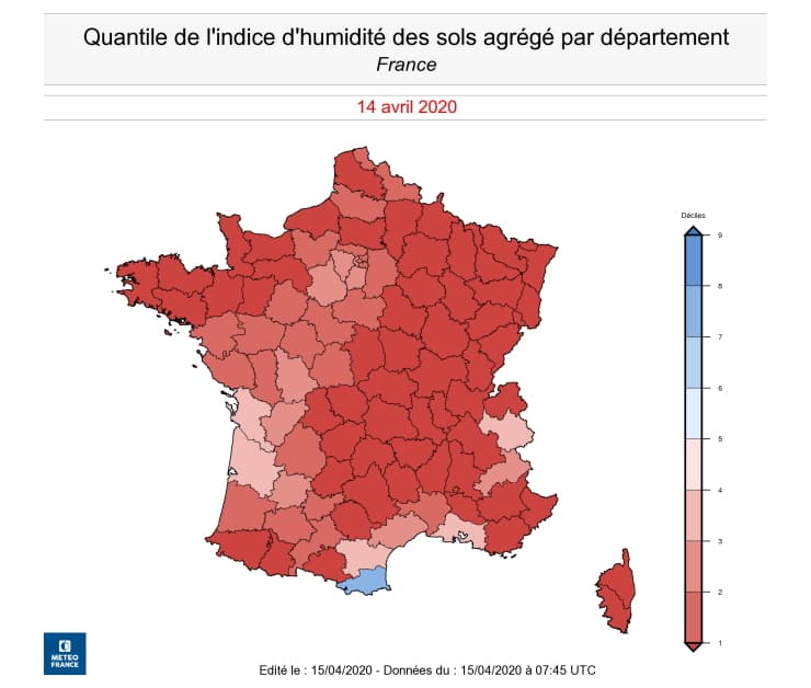 Carte de l'indice d'humidité des sols agrégé par département au 20 avril 2020 - via Météo-France