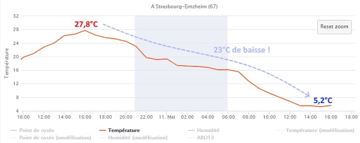 Évolution de la température entre le dimanche 10 et le lundi 11 mai 2020 à Strasbourg - via infoclimat
