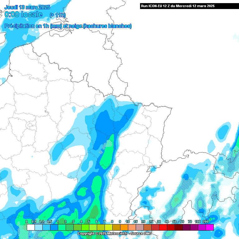 Précipitations sur le nord-est de la France ce jeudi 13 mars 2025 (hachures = neige) - meteociel.fr
