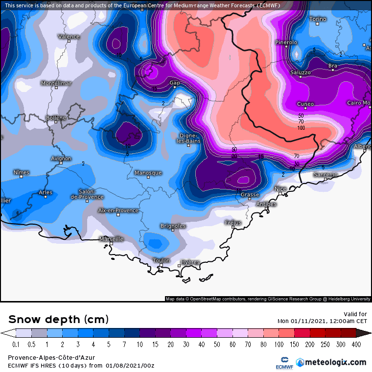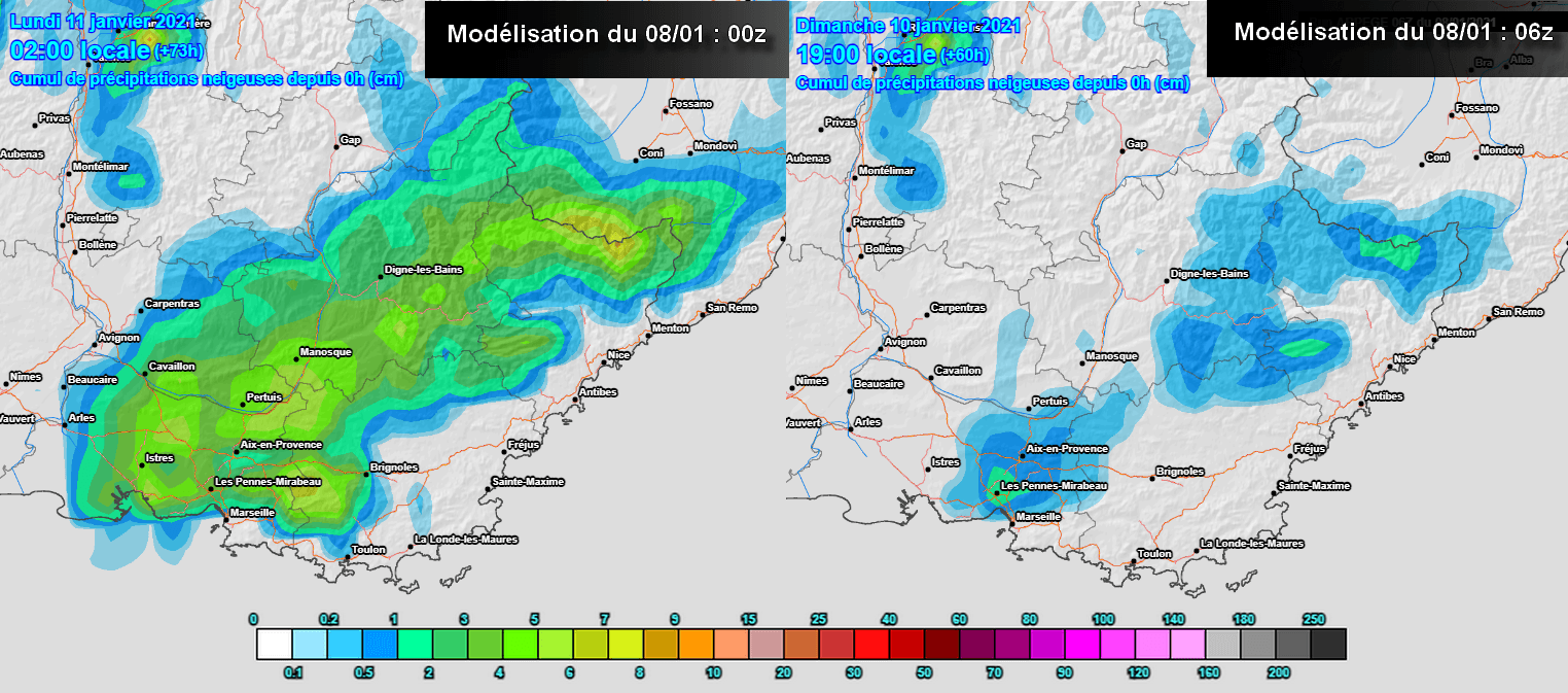 Le modèle Arpège, développé par Météo-France envisageait ce matin plusieurs centimètres de neige jusqu’au littoral des Bouches-du-Rhône, également dès 300/400m entre le Var et les Alpes-Maritimes. Sa réactualisation de ce vendredi midi est cependant bien plus sèche avec des précipitations restant majoritairement en mer.