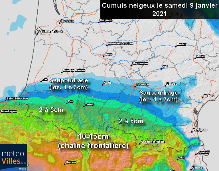 Les flocons pourront également s’inviter jusque dans les plaines du Sud-Ouest du pays (Toulouse/Auch/Pau) et même jusqu’au littoral des Pyrénées-Atlantiques, notamment en matinée de demain samedi 9 janvier.